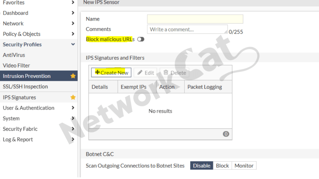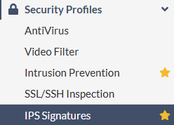 Bu özellik aktif edildiğinde “Security Profiles” kısmında aşağıdaki gözüktüğü üzere “Intrusion Prevention” sekmesi gelir. Bununla birlikte “IPS Signatures” sekmeside bu menüye eklenir.