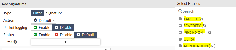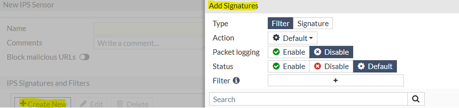 Diğer seçenek ise “IPS Signatures and Filtres” tararında yazıldığı gibi ister signature ister isek de filter bazlı engelleme yapabiliriz. Burada mevcut database tarafından gelen signature kullanabileceğimiz gibi bizde manuel olarak oluşturabiliriz.
