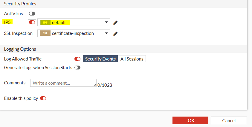 Bu kısmı bitirdikten sonra son aşama olarak oluşturduğumuz signature kısmını policy tarafında uygulamak kalıyor. Burada da yeni bir policy oluşturup veya mevcut policy üzerinde aşağıdaki gibi IPS kısmını aktifleştirip oluşturduğumuz signature uygulamamız gerekmektedir.
