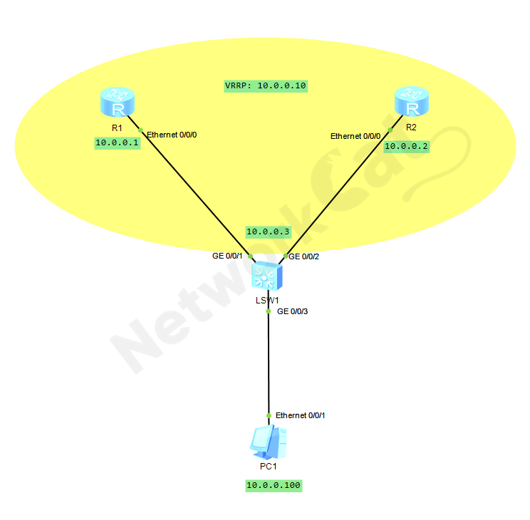 Yukarıdaki konfigürasyona baktığımızda R1 ve R2 cihazımızda VRRP çalışmaktadır. Üst katmanda çalıştırdığımız bu VRRP aşağıda bağlı bulunan LSW1 switch ve altındaki cihazların bağlantı yedekliliği sağladığı gibi kesintisiz erişime de olanak vermektedir.